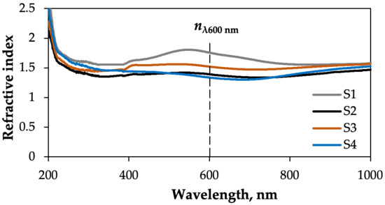 Figure 15 shows the variation in the refractive index (n) of the S1–S4 samples within the 200–1000 nm wavelength range. The spectral behaviour of the refractive indices of the obtained composites was very similar within the wavelength regions of 200–400 nm and 800–1000 nm. They are approximately 1.5. However, obvious differences can be seen in the 400–800 nm region.
