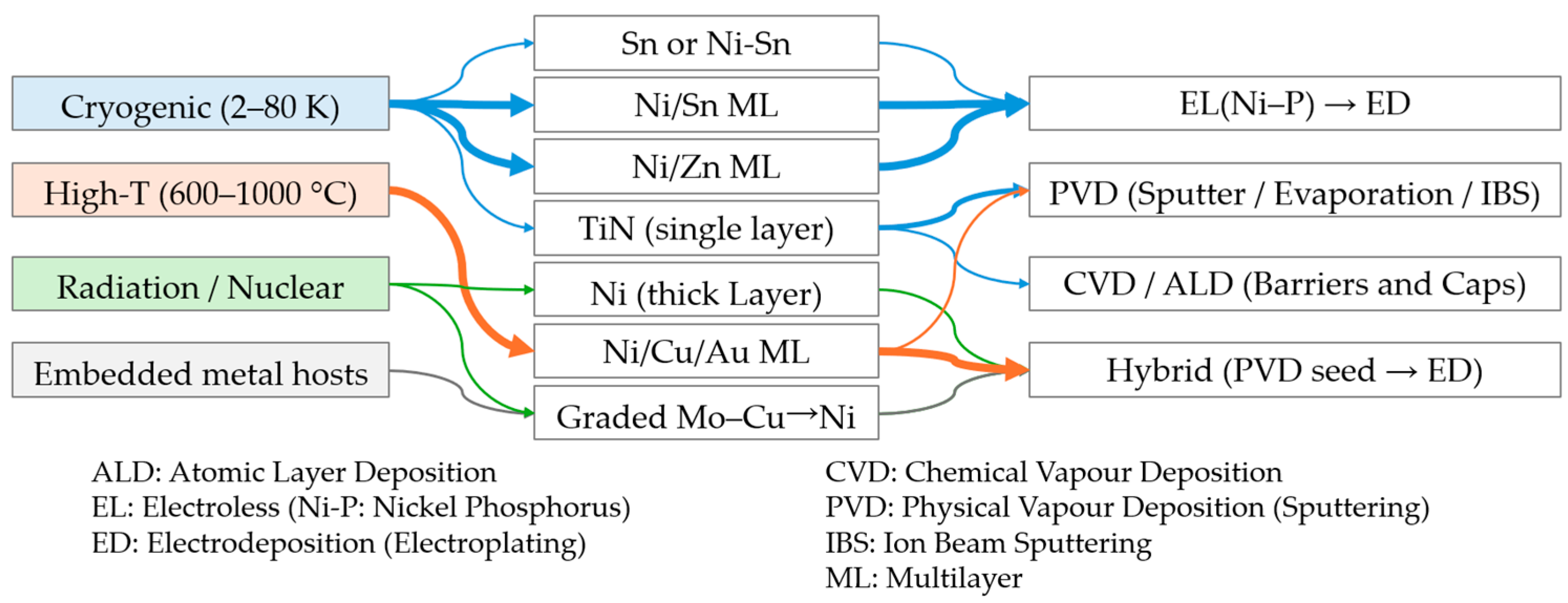 | Radiation/nuclear | Embrittlement, hydrogen accumulation, adhesion loss | Thick Ni | Evap seed → ED Ni | ≥10 µm; post-plating bake mandatory | ≈1× | Robust, but prone to H2 blisters if unbaked | [45] |