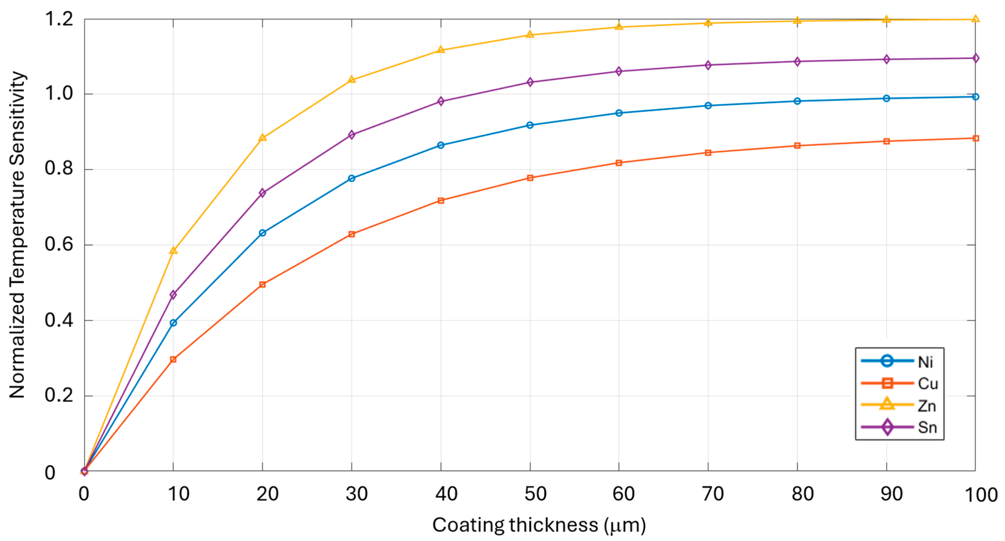 - Scurti, F.; McGarrahan, J.; Schwartz, J. Effects of Metallic Coatings on the Thermal Sensitivity of Optical Fiber Sensors at Cryogenic Temperatures. Opt. Mater. Express 2017, 7, 1754–1764. [Google Scholar] [CrossRef]
