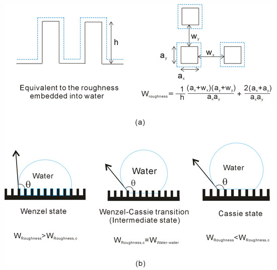 In our recent work [43], a wetting parameter (WRoughness) is proposed, which is directly related to the geometric attributes of surface texture, and utilized it to elucidate the Wenzel–Cassie wetting transition. During the transition from the Wenzel state to the Cassie state, the existence of a critical wetting parameter (WRoughness,c) is expected (Figure 1). Specifically, the Cassie state is predicted to occur when WRoughness is below this critical value (WRoughness < WRoughness,c).