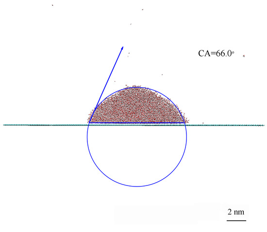 CAs were determined using the ImageJ software package (version 1.54g) [46] in conjunction with a contact angle plugin. Following the attainment of thermodynamic equilibrium in each simulated system, a near-spherical water droplet with a radius of approximately 4.0 nm was observed. To quantify the CA between the droplet and the substrate, a procedure involving manual selection was employed. This procedure required the identification of two points to define the baseline and three points along the droplet profile. These selected points were then utilized to define the droplet profile, which was subsequently used for CA calculation. In this study, the CA was measured three times for each droplet, resulting in an estimated uncertainty of approximately 3°.
