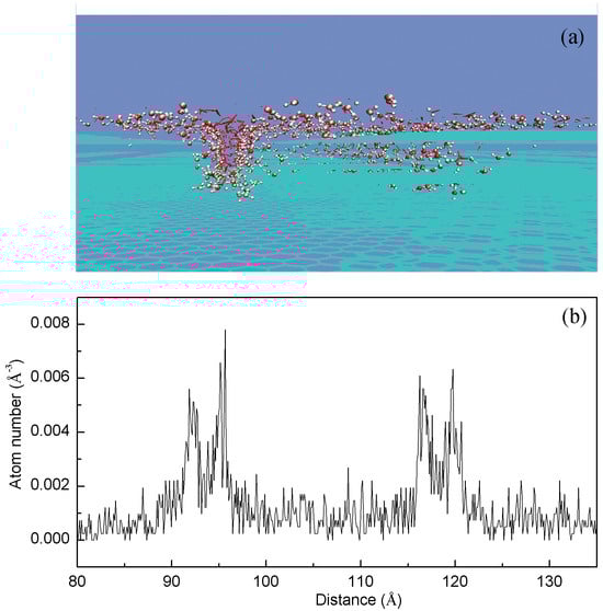 The simulations were conducted within a simulation box measuring 21.0 nm × 21.0 nm × 20.0 nm, with the graphite substrate constrained to a fixed position. The simulations were performed using a canonical ensemble (NVT), and a Nosé–Hoover thermostat was used to carefully maintain a constant temperature of 300 K. Periodic boundary conditions were imposed in all three spatial dimensions. Lennard-Jones interactions were truncated at a cutoff distance of 1.0 nm, and the particle mesh Ewald (PME) method was employed for calculating long-range electrostatic interactions. Each simulation was run for a duration of 2 ns, with a time step of 2 fs.