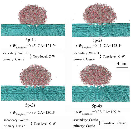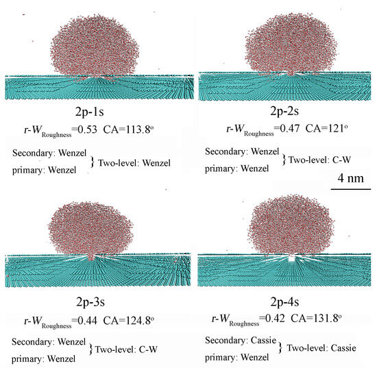Based on the MD simulations of primary and secondary surface roughness, these findings can be applied to investigate the dependence of superhydrophobicity in two-level roughness on both primary and secondary roughness characteristics. When the primary surface roughness is in the Wenzel state, the superhydrophobicity of the two-level surface can be related to either the Wenzel or Cassie state, depending on the characteristics of the secondary roughness. It is observed that the superhydrophobicity of the two-level roughness is influenced by both primary and secondary roughness features (Figure 6 and Table 2).