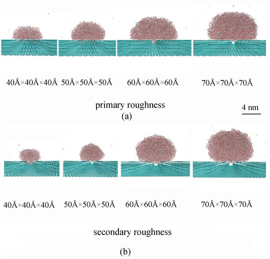 The wettability of surfaces with primary (a) and secondary (b) roughness was studied as a function of water droplet size. Cubic water droplets with dimensions of 40 Å × 40 Å × 40 Å, 50 Å × 50 Å × 50 Å, 60 Å × 60 Å × 60 Å, and 70 Å × 70 Å × 70 Å were initially positioned on the rough surfaces for simulations.