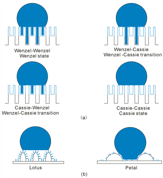 Based on the discussion of superhydrophobicity in two-level surface roughness, these principles can also be extended to understand the difference between the Lotus and Petal effects. Although both Lotus and Petal effects are related to two-level hierarchically roughness, the Lotus effect is associated with the Cassie state, while the Petal effect is attributed to the Wenzel–Cassie transition state (Figure 9). This is due to the combined effects of primary and secondary roughness on superhydrophobicity, which are in turn related to structural differences in the primary and secondary roughness features. In fact, these differences can be explained by the ratio between the surface overlap (SOvelap) and the volume of the primary roughness (VRoughness,primary), i.e., SOverlap/VRoughness,primary. Compared to hierarchical roughness exhibiting the Petal effect, a larger SOverlap and a smaller VRoughness,primary are typically observed for the surface roughness exhibiting the Lotus effect [66,67] (Figure 9).