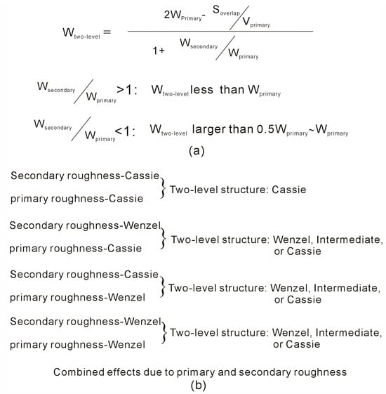 (I) Based on Equation (5), the WTwo-level parameter is related to the wetting parameters of primary and secondary roughness (WPrimary and WSecondary). Additionally, it is also influenced by the correlation between primary and secondary roughness (VSecondary/VPrimary, SOverlap/VPrimary). Therefore, it may be derived that the wetting parameter of two-level roughness, WTwo-level, mainly lies in the range from WPrimary to WSecondary. Of course, the value of WTwo-level may also be influenced by the relation between primary and secondary roughness, especially as WPrimary (or WSecondary) near to the critical wetting parameter.