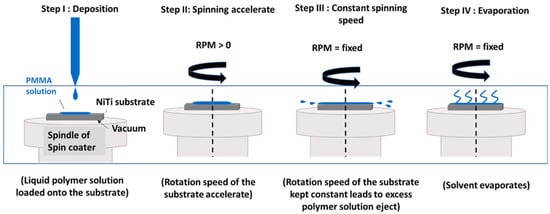 However, the spin-coating method stands against all because it produces a more uniform coating thickness, it has a low processing temperature, and it provides simplicity in fabrication [,]. The most important reason that the substrate NiTi is crucial is due to the presence of the shape memory effect. Any external stimulus, such as force or temperature, could alter the behavior of the shape memory effect. Spin coating is the most suitable method for the deposition of polymer film at a uniform size, with varying thickness from the nm to micron size without affecting the behavior of the shape memory property of the substrate []. The spin-coating process is widely applied in thin-film fabrication due to its simplicity and ability to produce uniform coatings. In particular, the thin film on a NiTi substrate plays a critical role in enhancing the performance of the NiTi–PMMA composite. Thin-film composites based on NiTi alloys have attracted significant attention in the biomedical field due to their unique properties, including their shape memory effect, superelasticity, deformation capability, and damping capacity. PMMA is considered a promising material in shape memory composites, offering the advantages of low density, a lightweight nature, and excellent shape recovery []. The heating response of polymers above their glass transition temperature (Tg) facilitates deformation, as the material transitions into a rubbery state. Upon unloading, the polymer retains much of the distorted shape due to constrained molecular mobility. Because NiTi and PMMA share key properties, including shape memory behavior, deformability, and biocompatibility, they are strong candidates for use in thin-film composites. Several research efforts have focused on integrating NiTi–polymer composites for applications in robotics, microfluidics, and pneumatic systems [,]. To harness the complementary behaviors of both the alloy and the polymer in a unified structure, we sought to optimize the fabrication of NiTi–PMMA composites using the spin-coating method [,]. The spin-coating method is widely employed as a simple, rapid, and controllable technique for producing high-quality PMMA films []. The process enables precise control over the coating thickness and surface morphology on NiTi shape memory alloy (SMA) substrates, particularly when combined with appropriate curing conditions. In spin coating, a liquid polymer solution is deposited onto a solid substrate, which is then rotated at a controlled speed []. Centrifugal forces generated during spinning spread the liquid uniformly across the substrate, while viscous forces within the solution govern film uniformity [,]. A schematic representation of the spin-coating process is shown in Figure 1, outlining four main stages: (i) deposition of the coating solution, (ii) acceleration of spinning, (iii) sustained spinning at a constant speed, and (iv) solvent evaporation leading to final film formation []. The corresponding spin profile is illustrated in Figure 2, where the rotation speed versus time highlights three key intervals. The initial ramp time (T1) corresponds to the acceleration from rest to the target speed, followed by a plateau region representing steady spinning at constant angular velocity. Finally, the ramp-down time (T3) denotes deceleration to zero, stabilizing the film without further rotation [].
