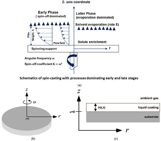 Here, t is the time since the start of the process, ω is the angular velocity, r is the distance from the center of rotation, ρ is the density, η is the dynamic viscosity, and h is the thickness of the fluid layer, rather than of the dry thin film. Here, ∂h/∂t represents the rate of change of the thickness, and ∂h/∂r is the rate of spreading. If the film is considered initially uniform, this leads to a description of the fluid film thickness []. The integration of Equation (3) yields