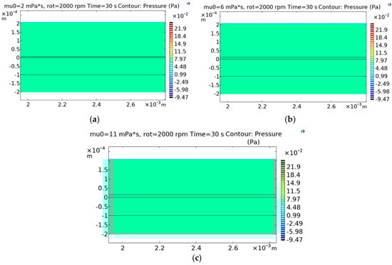 Figure 7a–c represent the pressure distribution along the substrate towards the coating layer at a fixed rpm of 2000, with a duration of the coating process of 30 s, for various viscosities at 2, 6, and 11 mPa·s. The color bar values show that there is a negligible difference in the pressure values despite the various viscosities. The pressure distribution remains the same along the configuration of the system from the substrate towards the coating layers. This result signifies that the pressure distribution remained the same along the assembly of the substrate towards the coating layers despite the various dynamic viscosities. Figure 8A represents the final layer of polymer deposited with time at a viscosity of 2 mPa·s. At various rpm values, it was observed that at a lower rotation of 100 rpm, the coating thickness predicted by COMSOL and the points were marked by the Emslie, Bonner, and Pec model using Equation (7), and a match was plotted. It was observed that at lower rpm, there was a slight deviation in matching; however, at higher rpm, there was complete agreement on the matching of the coating thickness and model values. The model was observed for two different viscosities at 6 and 11 mPa·s, which show similar trends of slight deviation at lower rpm but are well matched at higher rpm. The curve of the thickness slope decreases with the duration of the coating process.