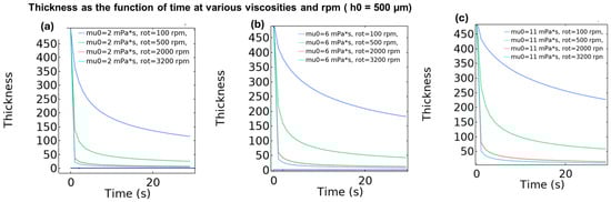 Combining the above rotation process, Figure 9c represents the thicknesses of the coating layer at various viscosities at a fixed time of the coating process. It was observed that at a lower rpm value of 100, the final thickness after 30 s of rotation at 2 mPa·s reached 125 µm; however, at an increase in viscosity to 6 mPa·s, the final thickness at 100 rpm reached the value of 200 µm. At a higher dynamic viscosity of 11 mPa·s, the final thickness reached up to 250 µm at a lower rotation per minute of 100 rpm.