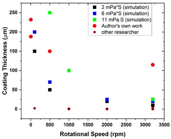 Figure 11 represents the thicknesses of the PMMA layer achieved at various viscosities and rotations of the substrate in the coating process. The study findings reveal that the final thickness of the coating layer was achieved by considering the amount of polymer solution used in this study. Figure 11 displays the good match between the simulation findings and experimental approach at 500 rpm for 2 mPa·s for 150 µm thickness; however, a mismatch is observed at the higher speed. This may vary due to the ambiguity at the initial volume of the polymer solution taken into consideration at lower viscosity.