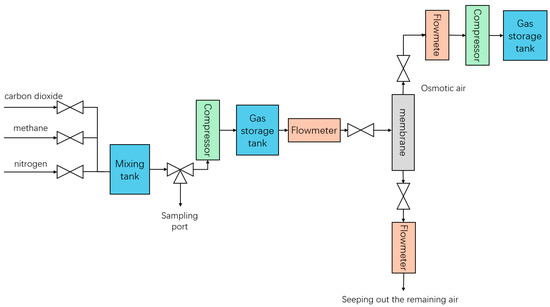 Once the gas sample is ready, it is adjusted to the desired flow rate and passed into the mixing tank. After the gas mixture tank reaches a certain pressure, we start the compressor to push the mixture into the gas storage tank, and in the process, the pump is turned on to cool the gas. Subsequently, the gas pressure and flow rate are adjusted to the experimental setpoint so that the gas mixture enters the membrane separator for separation. The separation pressure is controlled by the pressure gauge on the permeation side and the residual side. The flow rate on both sides is detected separately by the flow meter, and the composition of the gas outflow from both sides is detected (Figure 2).
