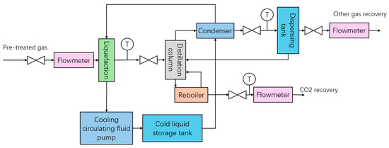 The gas on the permeable side after membrane separation enters the compressor for compression, and after compression, it is sent to the gas storage tank. We precisely control the flow and pressure of gas entering the liquefier by adjusting the back pressure valve and flow meter behind the gas tank. Next, the temperature and flow rate of the cooling circulation pump are adjusted to cool the gas deeply, and the pressure in the liquefier is adjusted to promote the liquefaction of the target gas (carbon dioxide). The liquefied material enters the distillation column, and by adjusting the operating parameters (mainly pressure) of the top condenser and the bottom reboiler, the normal flow of gas and liquid phases in the tower can be ensured so that the top gas phase and the bottom liquid phase products can be recovered smoothly. Finally, the flow rate of the top and bottom products is detected, and samples are taken separately to detect their composition (Figure 3).