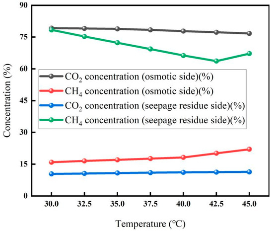 The effect of temperature on the membrane separation results is shown in Figure 4. It can be seen from the figure that the CO2 concentration on the osmotic side decreases slowly with the increase in temperature, while the CH4 concentration on the osmotic side increases gradually. The CO2 concentration on the seepage side decreased slowly from 30 °C to 45 °C, and the CH4 concentration gradually decreased from 30 °C to 40 °C.