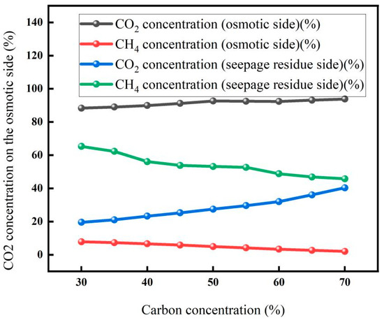 The experimental results for carbon concentration on membrane properties are shown in Figure 5. With the increase in carbon concentration, the CO2 concentration on the osmotic side showed an upward trend, while the CH4 concentration on the osmotic side decreased slowly. This is because increasing the concentration of inlet CO2 raises its partial pressure, enhancing the driving force for permeation according to the solution–diffusion model. However, at high CO2 concentrations, membrane swelling or plasticization may occur, which could alter permeation behavior. In this study, the membrane material was selected for its resistance to plasticization under the tested conditions, though long-term exposure was not evaluated. On the other hand, the increased concentration of imported CO2 also weakens the adsorption competition effect in the separation membrane, which also promotes the osmotic process of CO2 to a certain extent and increases the concentration of CO2 in the osmotic gas. The slow decrease in CH4 concentration is due to the low concentration of CH4 in feedstock gas, and the other is the high concentration of CO2, which weakens the competitive adsorption effect of CH4 [31].