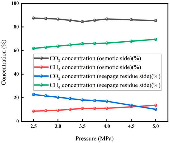 The effect of pressure on membrane separation is shown in Figure 6. The results showed that the CO2 concentration on the osmotic side showed a downward trend with the increase in pressure, while the CH4 concentration on the osmotic side gradually increased with the increase in pressure. With the increase in pressure, the CO2 concentration on the seepage side decreased significantly, and the CH4 concentration on the seepage side increased significantly. This is because when the gas penetrates into the membrane, it will go through the process of dissolution and diffusion; that is, the gas first dissolves on the surface of the membrane, and the dissolved gas diffuses under the action of concentration difference and completes the entire osmosis process through desorption after reaching the other surface of the membrane. When the CO2 mixture penetrates into the membrane, there will be an adsorption competition effect, resulting in slow gas (gas with a small permeability rate, i.e., CH4) slowing down the fast gas (gas with a large permeability rate, i.e., CO2), and the fast gas will also make the slow gas faster. As the inlet pressure increases, the adsorption competition effect intensifies. While this leads to more CO2 transmission through the membrane, it also results in more CH4 permeation, ultimately causing a decrease in CO2 concentration on the permeation side. Therefore, when the pressure is 2.5 Mpa, the CO2 concentration on the seepage side can reach up to 87.5%, and the lowest CO2 concentration on the leachate side is 10.25%.
