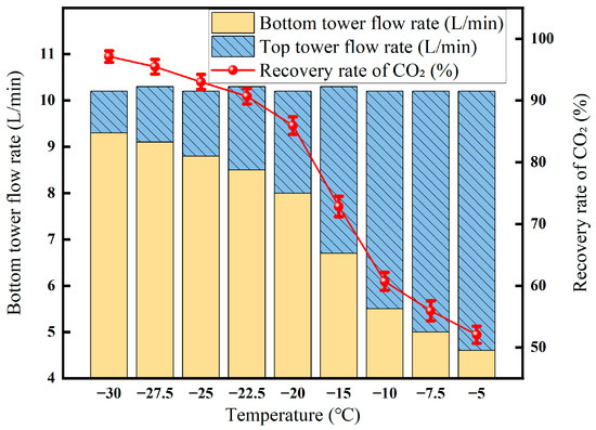 From the experimental results in Figure 8, it can be seen that at a temperature of −30 °C, the flow rate is 10.2 L/min, and the CO2 concentration is 85%. The concentration of CO2 in the gas at the top of the tower gradually decreases with the increase in pressure, and the gas flow rate decreases due to the increase in liquefaction capacity with the increase in pressure [33]. With the increase in liquefaction pressure, the flow rate of the tower kettle increases because the liquefaction capacity is enhanced, and more gas is present in the liquid equivalent. However, the concentration of CO2 in the bottom product of the tower decreases because when the liquefaction pressure is high, some of the other gases are also liquefied, and with the increase in liquefaction pressure, the number of other gases liquefied increases, so the content of carbon dioxide decreases.