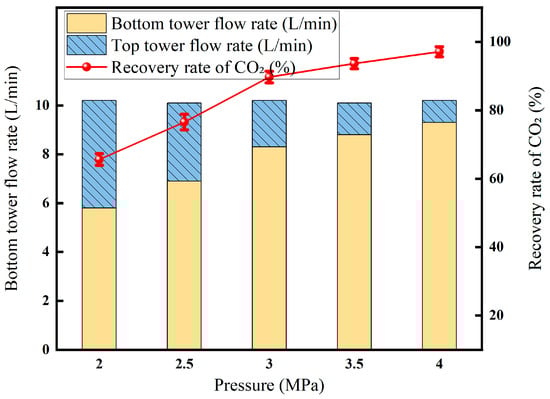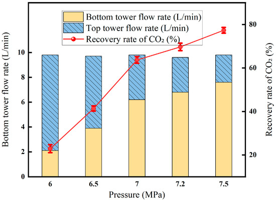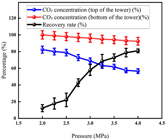 From the experimental results in Figure 9, it can be seen that at a temperature of 10 °C (pressure: 7.4 MPa; a temperature of 31.1 °C is the critical point of carbon dioxide—when the temperature and pressure are liquefied, the temperature and pressure should be based on this), the flow rate is 10.2 L/min, and the CO2 concentration is 85%; the experimental results are shown in Figures, which is consistent with the results at low pressure and low temperature, and the concentration of CO2 in the top gas and the tower cauldron products decreases with the increase in pressure.