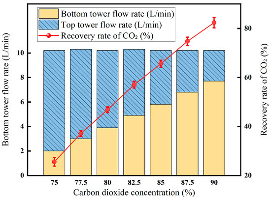 The results of the low-temperature fractionation experiments at different carbon dioxide concentrations are shown in Figure 10. The experimental results show that when the temperature is −30 °C, the pressure is 2 MPa, and the flow rate is 10 L/min, the concentration of CO2 in the top gas of the tower remains basically unchanged at about 70%, and the concentration of CO2 in the tower gas remains at about 96%. The results show that when the temperature, pressure, and gas flow rate are determined, the CO2 content in the tower kettle gas and the tower top gas is less affected by the CO2 content in the feed gas. However, the CO2 concentration in the feed gas will affect the flow rate of the tower top gas and the tower kettle gas. When the CO2 content of the feed gas is 75%, the tower top gas flow rate is 8.2 L/min, and the tower kettle gas is 2.0 L/min; when the CO2 content in the feed gas is 90%, the tower top gas flow rate is 2.5 L/min, and the tower kettle gas is 7.7 L/min. The CO2 recovery rate increases with the increase in CO2 content.