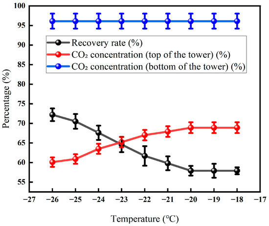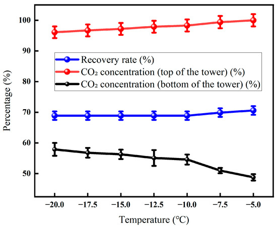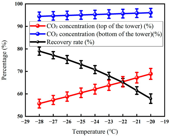 Effect of tower roof temperature on CO2 recovery (Test conditions: CO2 concentration: 60%, pressure: 5 MPa, flow rate: 50 L/min, seepage gas pressure: 1.0 MPa, permeable gas pressure: 0.5 MPa, low-temperature fractionation liquefaction temperature and tower kettle temperature: −20 °C, pressure: 3 MPa).