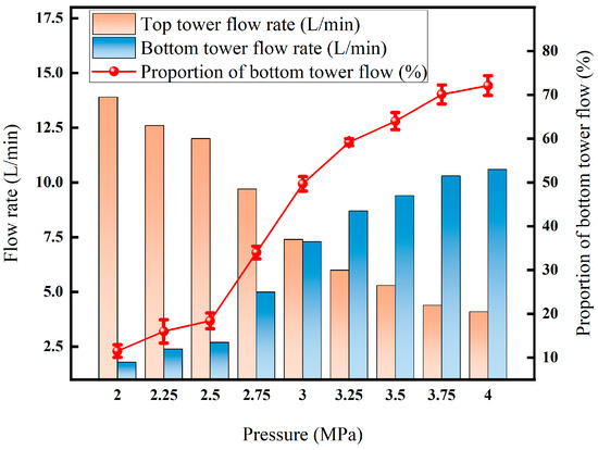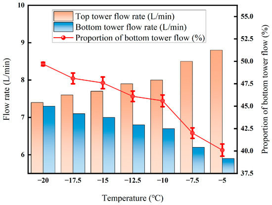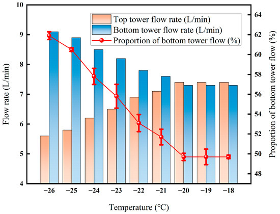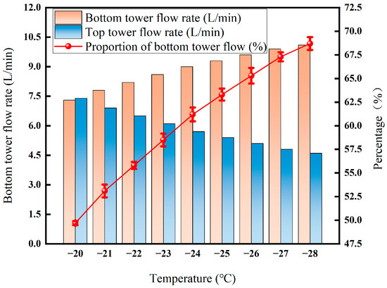 As can be seen from Figure 12, the flow rate at the bottom of the tower increased from 7.3 L·min−1 to 10.1 L·min−1, and the proportion also increased from 49.7% to nearly 68.7%. After the temperature is below −25 °C, the proportion of flow at the bottom of the tower increases to 68.7%. The reason is that the viscosity of the liquid phase increases at low temperatures, which causes the resistance to flow to increase [34]. At the same time, the cooling demand for the system increases exponentially, resulting in increased compressor power consumption and equipment risk.