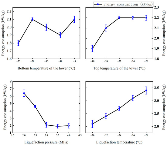 In summary, liquefaction temperature and pressure are the main factors affecting liquefaction energy consumption, while the temperature of the tower top and tower cauldron has relatively little effect. By optimizing the operating parameters, the liquefaction pressure is controlled at around 3.5 MPa. The temperature of the tower kettle is controlled in the range of −10 °C to −25 °C to avoid excessive reduction in the liquefaction temperature, and the energy consumption of the system can be effectively controlled at a low level.