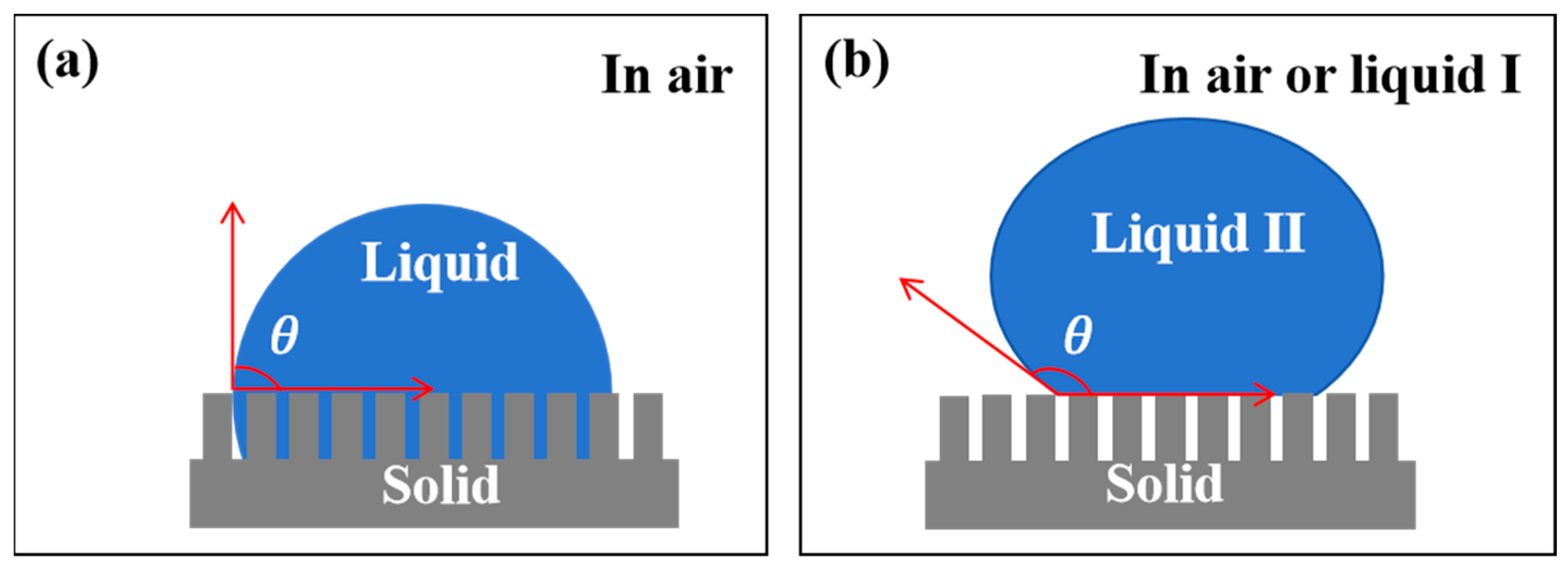 - Cassie, A.B.D.; Baxter, S. Wettability of porous surfaces. Trans. Faraday Soc. 1944, 40, 546–551. [Google Scholar] [CrossRef]