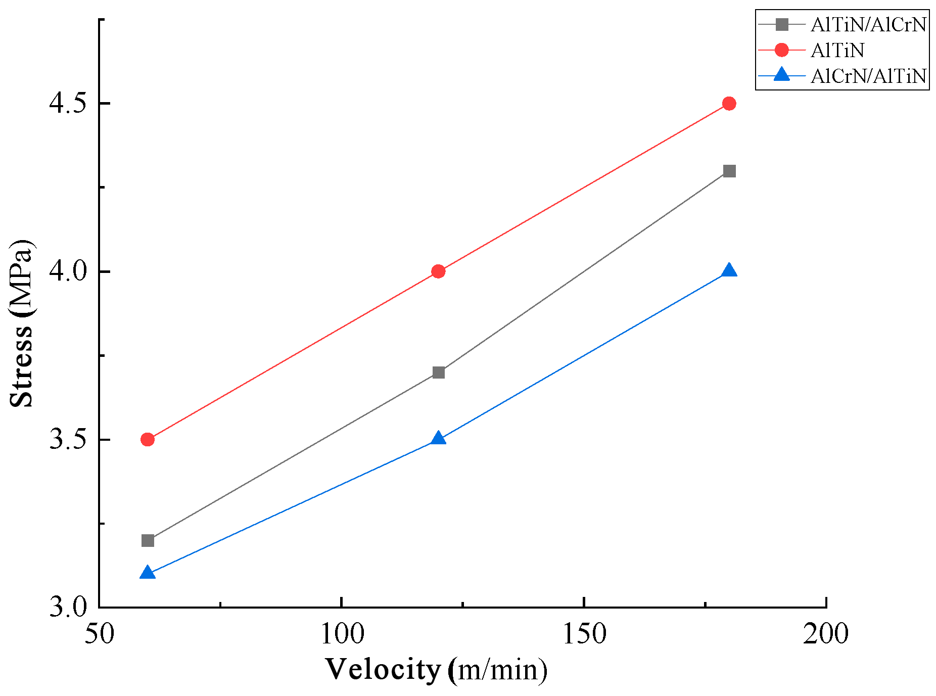 - The double-layer AlCrN/AlTiN-coated tool exhibits the lowest maximum cutting temperature and cutting stress on both its rake face and tool substrate during machining compared to the other two types of coated tools (AlTiN and AlTiN/AlCrN).