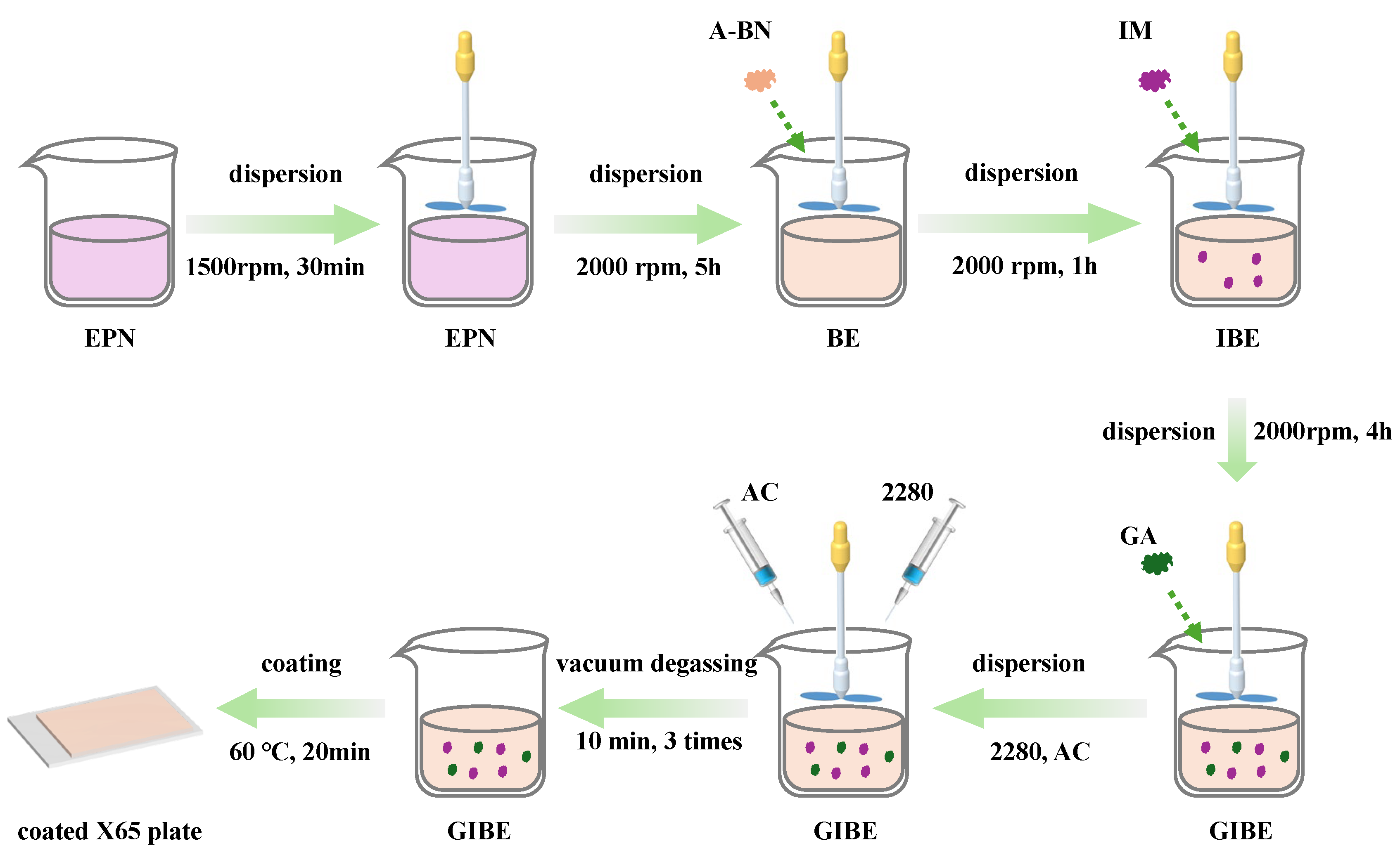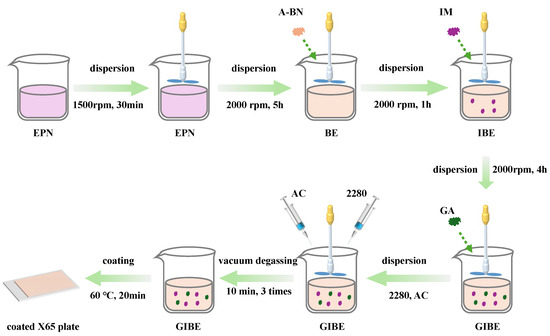 A self-healing anti-corrosion coating was prepared by uniformly dispersing functional fillers—A-BN, IM, and GA—together with acetone as the solvent and Ancamine 2280 as the curing agent into an EPN via mechanical stirring. A schematic diagram of the coating preparation process is shown in Figure 2. The entire procedure consisted of the following stages: resin dispersion, filler incorporation, solvent and curing agent addition, and vacuum degassing.