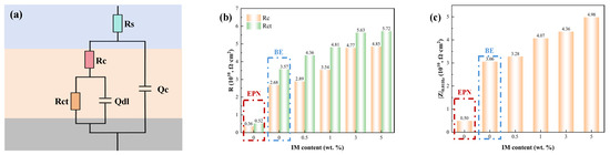 The |Z|0.01Hz is widely used as a semi-quantitative indicator for evaluating coating corrosion performance, where higher values correspond to better corrosion resistance [20]. As depicted in Figure 3b, the |Z|0.01Hz values of BE and IBE coatings are significantly higher than that of the pure EPN coating, confirming that the addition of BN and IM fillers substantially improves the anti-corrosion performance. Furthermore, the |Z|0.01Hz value of the IBE coating increases gradually with IM content, corroborating the enhancement in corrosion resistance with optimal IM loading.