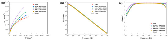 Building upon the optimized I5BE coating formulation, the influence of GA content on the corrosion resistance of GI5BE coatings was systematically investigated to determine the optimal GA concentration. The corresponding test results are presented in Figure 5. As evident from the Nyquist plots (Figure 5a), all GI5BE coatings exhibit significantly larger capacitive arc radii compared to the I5BE coating, demonstrating that GA incorporation substantially enhances the corrosion protection performance. Furthermore, the Bode plots (Figure 5b,c) reveal that both the |Z|0.01Hz and phase angle initially increase with GA content up to a certain threshold, followed by a subsequent decrease. This trend indicates that the corrosion resistance of GI5BE coatings is non-monotonic with GA loading, first strengthening and then weakening as concentration increases. Notably, the composite coating containing 2.0 wt.% GA demonstrates optimal corrosion protection performance, achieving the highest |Z|0.01Hz values and most stable phase angle characteristics among all tested formulations.