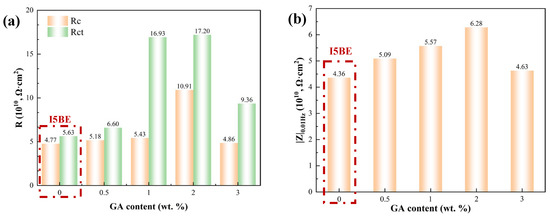 The EIS data of the GI5BE coatings were further fitted using the equivalent circuit model shown in Figure 4a. The resulting Rc and Rct values are presented in Figure 6a, revealing a clear trend where both parameters initially increase and then decrease with increasing GA content. This non-monotonic behavior is consistent with the variation observed in the |Z|0.01Hz, as shown in Figure 6b. Through collective analysis of the |Z|0.01Hz values, Rct, Rc, and capacitive arc radius, it is evident that the corrosion resistance of the GI5BE coating first strengthens and then weakens as the GA content rises. The optimal corrosion protection performance is achieved at a GA concentration of 2.0 wt.%, and this formulation is accordingly designated as the G2I5BE coating.