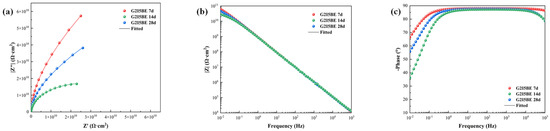EIS results for GI5BE coatings. (a) Nyquist; (b) Bode-|Z|; (c) Bode-phase.