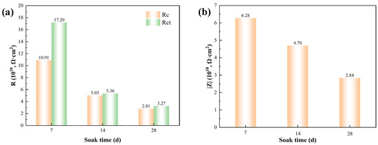 EIS fitting results for the IBE coating. (a) The fitted parameters of Rc and Rct for G2I5BE coatings; (b) The impedance modulus (Zf = 0.01 Hz) after soaking in synthetic seawater solution for 28 days at 60 °C.
