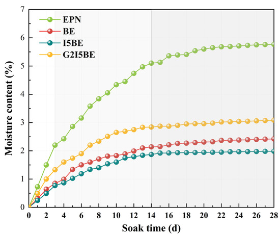 The incorporation of functional fillers including A-BN, IM, and GA significantly influences the water uptake behavior of coatings, which subsequently affects their corrosion protection performance. Based on the EIS evaluation results, four representative coating systems—EPN, BE, I5BE, and G2I5BE—were selected for a 28-day water absorption test following ASTM D870. The results are presented in Figure 9.