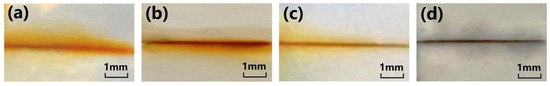 Macroscopic observations of the damaged regions on the EPN, BE, I5BE, and G2I5BE coatings are presented in Figure 10. As shown in Figure 10a,b, extensive reddish-brown corrosion products are visible along the scratches on both the EPN and BE coatings, indicating that neither system possesses self-healing capability. When the coating is damaged, corrosive species directly reach the metal substrate, inducing severe corrosion. In contrast, the I5BE coating containing 5.0 wt.% IM (Figure 10c) shows a notable reduction in rust formation along the scratch. This suggests that the incorporation of IM imparts a certain degree of self-healing functionality, significantly suppressing substrate corrosion, though some localized attack remains evident. Notably, the G2I5BE coating with 2.0 wt.% GA (Figure 10d) exhibits no visible rust deposits at the damaged area. This demonstrates that the addition of GA confers strong self-healing performance, effectively protecting the metal substrate and significantly inhibiting corrosion initiation even after mechanical damage.