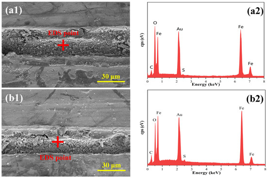 The elemental composition of the exposed metal substrate at the damaged coating areas was analyzed by EDS, with results presented in Figure 11(a2–d2). As shown in Figure 11(a2,b2), the exposed substrate surfaces under the EPN and BE coatings are primarily composed of C, O, Fe, and S. Among these, C, O, and Fe are characteristic of iron-based corrosion products, while S originates from inorganic salts present in the simulated seawater environment. In contrast, the EDS spectra of the metal surfaces beneath the I5BE and G2I5BE coatings (Figure 11(c2) and (d2), respectively) reveal the presence of not only C, O, and Fe, but also N. This detection of nitrogen can be attributed to the adsorption and complexation of IM and GA molecules on the metal surface, supporting the hypothesis of an inhibitor-derived protective layer formation. These elemental findings align well with the observed self-healing behavior, confirming the role of IM and GA in enabling active corrosion protection at defect sites.