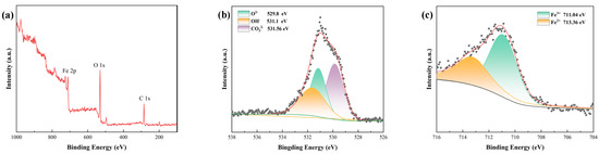 XPS deconvolution of the carbon steel surface where the EPN coating was broken: (a) XPS survey, (b) O 1s, (c) Fe 2p.