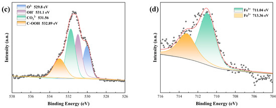 The XPS analysis results of the corrosion products formed on the metal substrate at the damaged area of the EPN coating are presented in Figure 12. The XPS survey scan (Figure 12a) indicates that the exposed metal surface primarily consists of Fe, O, and C elements. The detected carbon is attributed to adventitious hydrocarbon contamination commonly encountered in XPS analysis and was excluded from further consideration. The high-resolution O 1s spectrum (Figure 12b) was deconvoluted into three characteristic peaks at 529.8 eV, 531.1 eV, and 531.56 eV, corresponding to CO32−, OH−, and O2− species, respectively [21,22,23,24,25]. Furthermore, the high-resolution Fe 2p spectrum (Figure 12c) exhibits two major peaks at binding energies of 711.04 eV and 713.36 eV, assigned to Fe2+ and Fe3+ oxidation states [26,27].