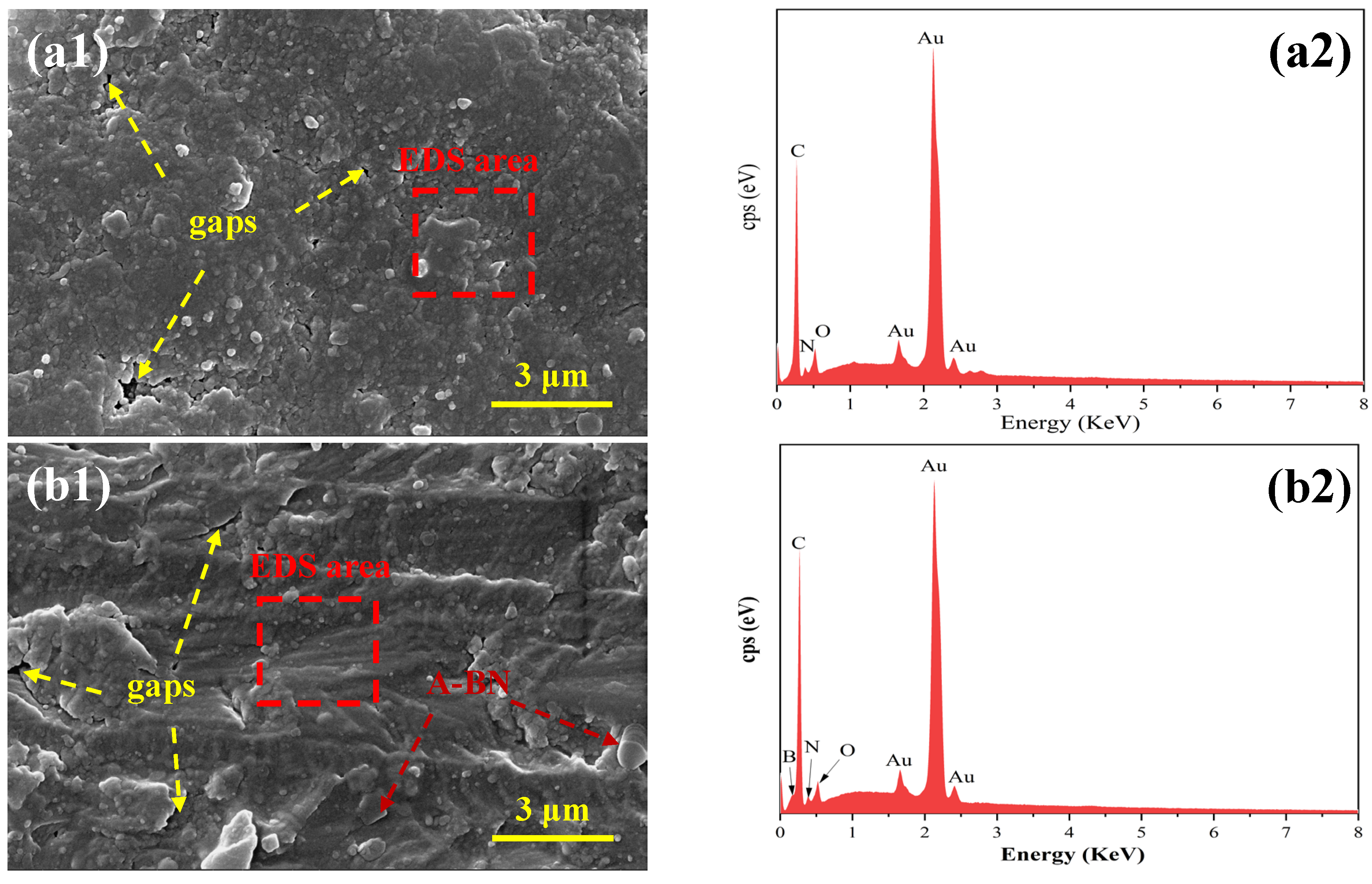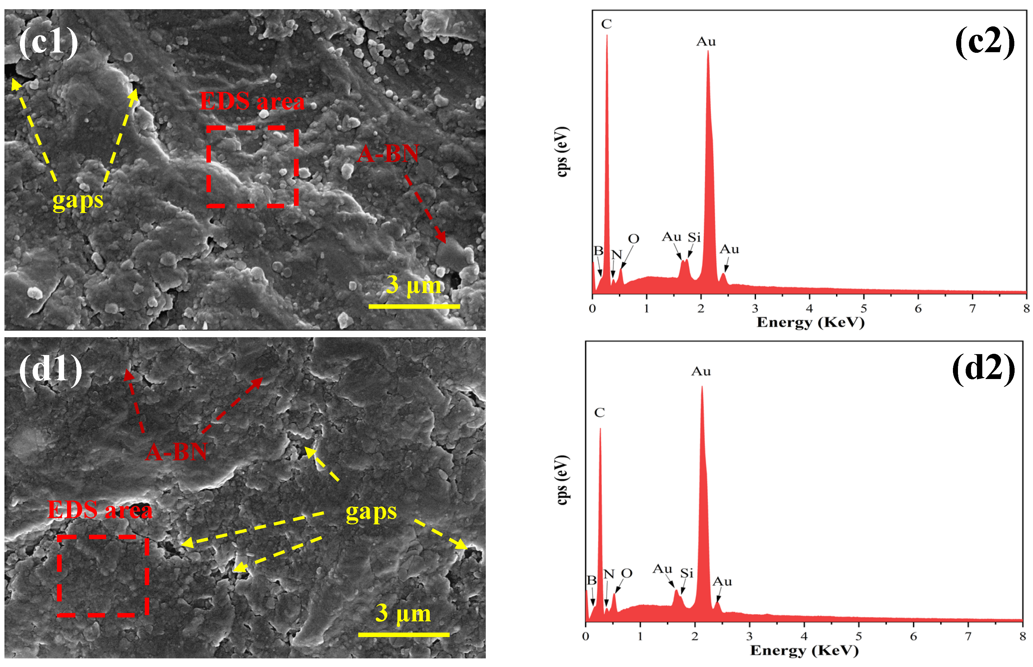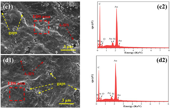 The corresponding EDS elemental analysis results for the different coatings are presented in Figure 14(a2–d2). As shown in Figure 14(a2), the EPN coating primarily consists of C, N, and O elements. In contrast, the BE, I5BE, and G2I5BE coatings (Figure 14(b2–d2)) exhibit a consistent elemental profile containing C, N, O, and B, with the detected boron originating from the A-BN filler. This uniform distribution of boron throughout the coating matrix confirms the effective dispersion and integration of A-BN within the epoxy-phenolic system, while the consistent elemental patterns across the modified coatings indicate that the incorporation of IM and GA does not disrupt the fundamental composite structure.