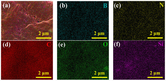 EDS analysis was performed to examine the elemental distribution within the G2I5BE coating, thereby evaluating the dispersion state of different functional fillers. The results are presented in Figure 15. The EDS spectrum (Figure 15a) confirms that the coating contains C, N, O, Si, and B as the primary elements. As shown in Figure 15b,f, both B and Si elements—characteristic of the A-BN filler—exhibit homogeneous distribution throughout the coating, indicating effective dispersion without significant aggregation. Furthermore, the spatial distributions of C, N, and O are displayed in Figure 15c–e. Given that the EPN resin and GA contribute mainly to C and O signals, while IM and the Ancamine 2280 curing agent introduce N in addition to C and O, the uniform mapping of these three elements suggests that IM, GA, and other organic components are also well-dispersed in the coating matrix. This homogeneous elemental distribution further confirms the successful integration of multiple functional fillers and the absence of localized agglomeration, thus validating the effectiveness of the coating preparation process.