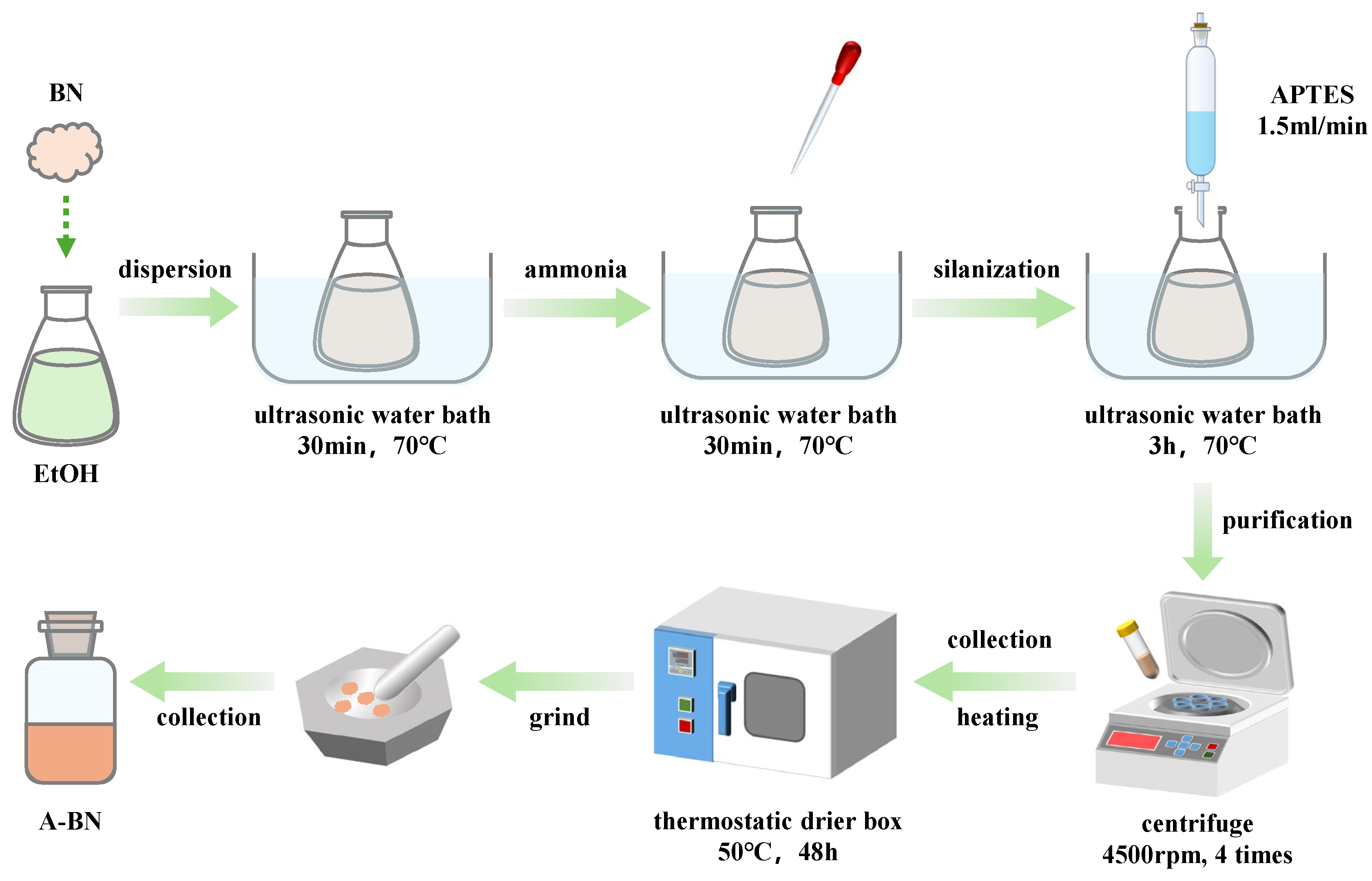 The required quantity of h-BNNs was first weighed and added to anhydrous ethanol at a mass ratio of 1:15 (h-BNNs to ethanol). Subsequently, h-BN nanosheets were prepared via ultrasonic-assisted liquid-phase exfoliation. Specifically, a mixture of h-BN powder and anhydrous ethanol was subjected to ultrasonic dispersion (AK-080SD, Yu Clean, Shenzhen Xin Kai Da Electronics Co., Ltd., Shenzhen, China) for 30 min in a 70 °C water bath to ensure uniform and complete exfoliation of h-BN nanosheets. Ammonia solution was then introduced into the mixture at a mass equivalent to 5% of the h-BNNs to catalyze the subsequent hydrolysis of APTES molecules. Finally, the silanization of h-BNNs was carried out via a sol–gel process. An amount of APTES equivalent to 3% of the h-BNNs mass was introduced into a separatory funnel and added dropwise to the h-BNNs-ethanol-ammonia mixture. After complete addition, the mixture was further subjected to ultrasonic dispersion under continuous water bath heating at 70 °C for 3 h to promote uniform covalent bonding between silane molecules and h-BNNs, resulting in the final A-BN product. All the above steps were performed in an ultrasonic bath maintained at a constant temperature of 70 °C. The A-BN were then purified by centrifugal washing: the product was centrifuged at 4500 rpm for four cycles to remove unreacted ammonia and APTES residues, and the precipitate collected from the bottom of the centrifuge tube was retained. Subsequently, the purified A-BN were dried in a constant-temperature oven at 50 °C for 48 h. Finally, the dried product was gently ground using an agate mortar to prevent agglomeration and ensure a uniform dispersion.