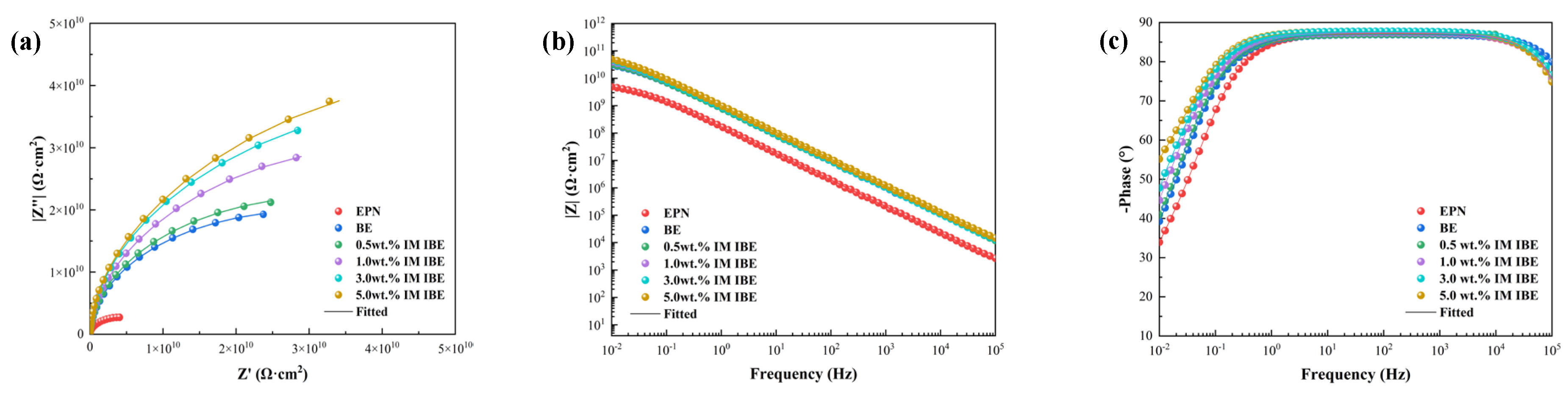 Based on the EIS results, the effect of IM content on the anti-corrosion performance of IBE coatings and its optimal concentration were investigated, as shown in Figure 3. In the Nyquist plot (Figure 3a), the incorporation of fillers such as BN and IM significantly enlarges the capacitive arc radius compared to the pure EPN coating, indicating a marked improvement in corrosion resistance. Moreover, the capacitive arc radius of the IBE coating increases with rising IM content, demonstrating that IM further enhances the protective properties. The IBE coating with 5.0 wt.% IM exhibits the best corrosion resistance.