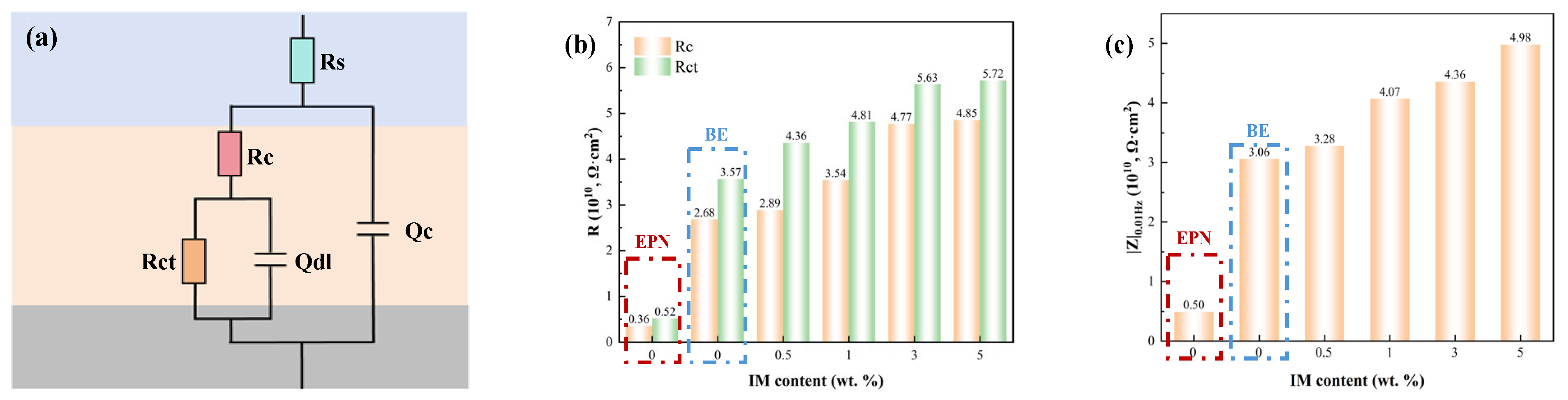Figure 4. EIS fitting results for the IBE coating. (a) Equivalent Circuit Diagram Model; (b) The fitted parameters of Rc and Rct for EPN, BE and IBE coatings; (c) The impedance modulus (Zf = 0.01 Hz) after soaking in synthetic seawater solution for 7 days at 60 °C.