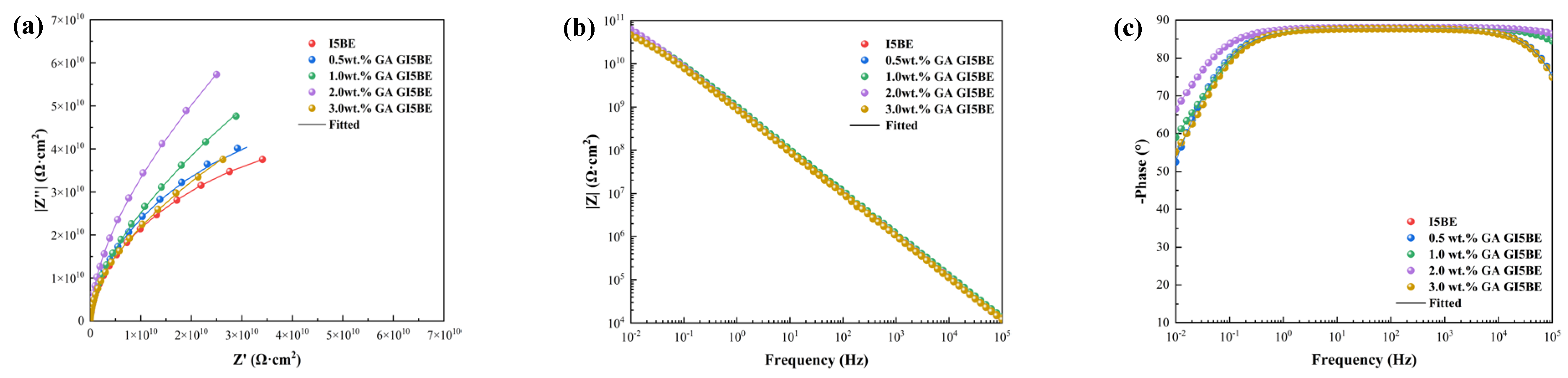 Figure 5. EIS results for GI5BE coatings. (a) Nyquist; (b) Bode-|Z|; (c) Bode-phase.