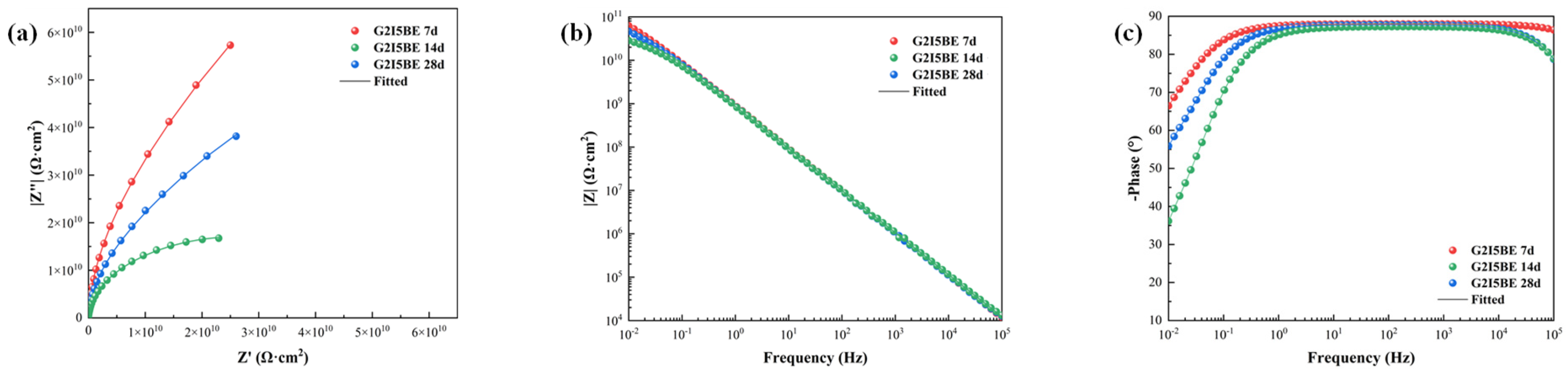 Figure 7. EIS results for G2I5BE coatings. (a) Nyquist; (b) Bode-|Z|; (c) Bode-phase.