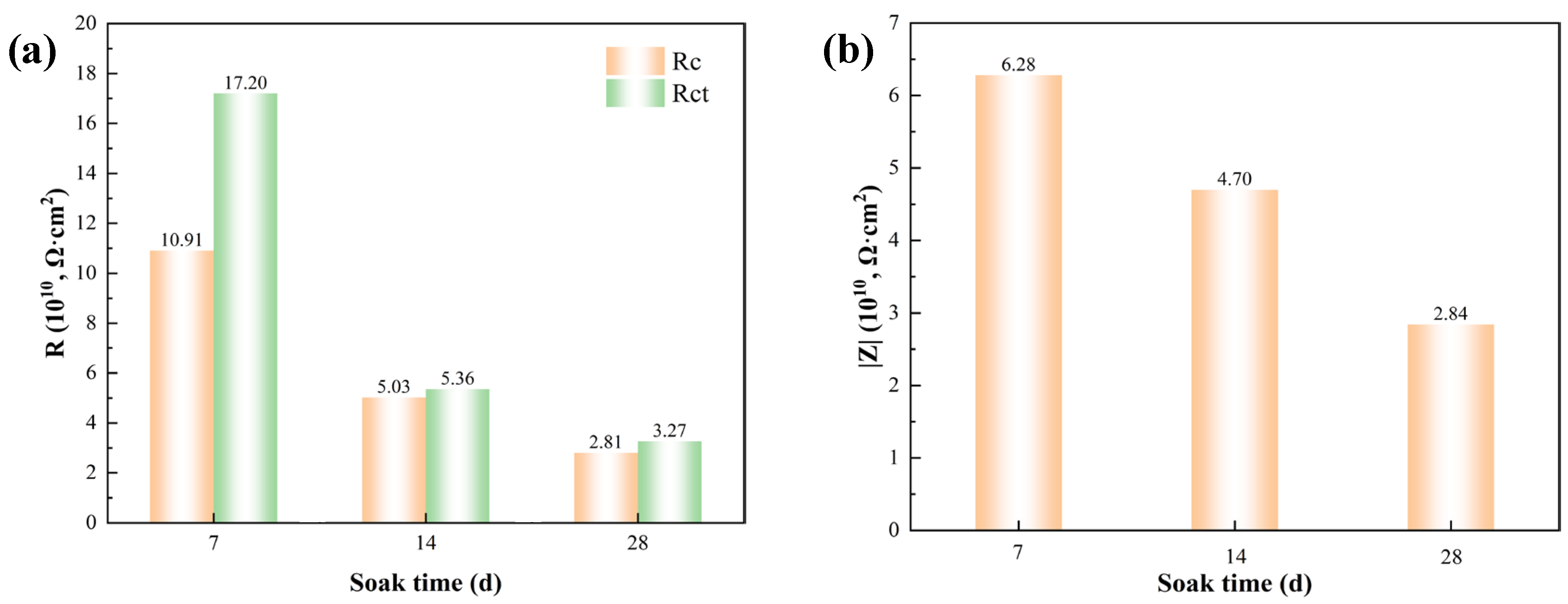 Figure 8. EIS fitting results for the IBE coating. (a) The fitted parameters of Rc and Rct for G2I5BE coatings; (b) The impedance modulus (Zf = 0.01 Hz) after soaking in synthetic seawater solution for 28 days at 60 °C.