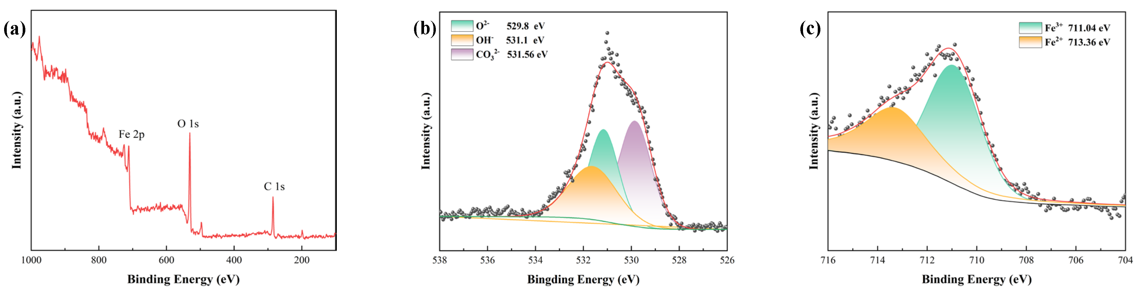 Figure 12. XPS deconvolution of the carbon steel surface where the EPN coating was broken: (a) XPS survey, (b) O 1s, (c) Fe 2p.