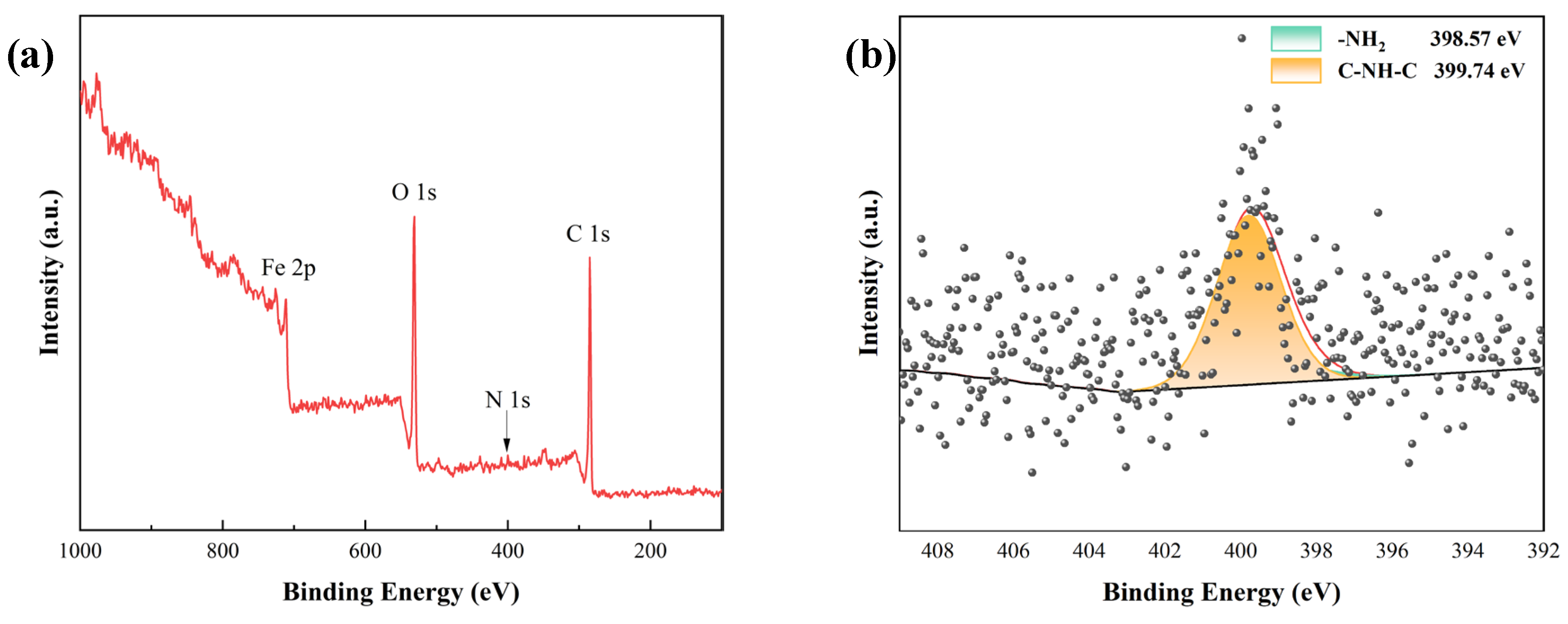 The XPS analysis results of the corrosion products formed on the metal substrate at the damaged area of the G2I5BE coating are presented in Figure 13. The XPS survey scan (Figure 13a) reveals that the exposed metal surface primarily contains Fe, O, N, and C elements. As with the previous analysis, the detected carbon is attributed to adventitious hydrocarbon contamination and was excluded from further consideration. The high-resolution N 1s spectrum (Figure 13b) was deconvoluted into two characteristic peaks at 399.74 eV and 398.57 eV, corresponding to C-NH-C and C-NH2 functional groups, respectively [21,22]. These nitrogen species originate from the released IM molecules that have adsorbed onto the metal surface at the scratch site. The high-resolution O 1s spectrum (Figure 13c) exhibits four distinct peaks at binding energies of 529.8 eV, 531.1 eV, 531.56 eV, and 532.89 eV, assigned to O2−, OH, CO32−, and C-OOH species, respectively [23,25,28]. Comparative analysis with the EPN coating confirms that the C-OOH peak derives from the adsorption and protective film formation of GA molecules on the steel substrate. Furthermore, the high-resolution Fe 2p spectrum (Figure 13d) shows two primary peaks at 711.04 eV and 713.36 eV, corresponding to Fe2+ and Fe3+ oxidation states [26,27]. The significantly reduced intensity of these iron oxide peaks compared to the EPN coating further corroborates the effective corrosion inhibition provided by the IM and GA combination.