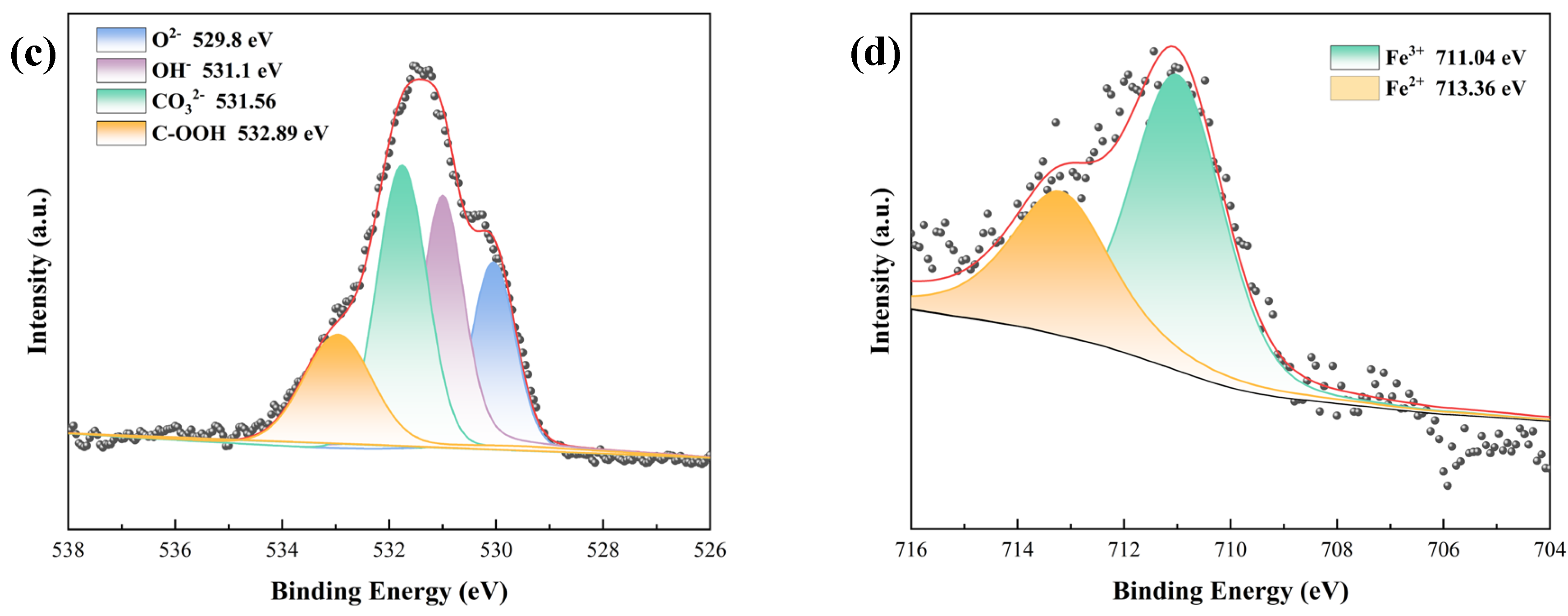 The XPS analysis results of the corrosion products formed on the metal substrate at the damaged area of the EPN coating are presented in Figure 12. The XPS survey scan (Figure 12a) indicates that the exposed metal surface primarily consists of Fe, O, and C elements. The detected carbon is attributed to adventitious hydrocarbon contamination commonly encountered in XPS analysis and was excluded from further consideration. The high-resolution O 1s spectrum (Figure 12b) was deconvoluted into three characteristic peaks at 529.8 eV, 531.1 eV, and 531.56 eV, corresponding to CO32−, OH, and O2− species, respectively [21,22,23,24,25]. Furthermore, the high-resolution Fe 2p spectrum (Figure 12c) exhibits two major peaks at binding energies of 711.04 eV and 713.36 eV, assigned to Fe2+ and Fe3+ oxidation states [26,27].